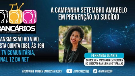 A campanha Setembro Amarelo em prevenção ao suicídio é o tema do TV Bancários desta quinta-feira (8). A convidada do programa é Fernanda Sousa Duarte, mestre e doutora em Psicologia, professora colaboradora no Programa de Pós-Graduação em Psicologia Social do Trabalho e das Organizações da Universidade de Brasília (UnB), diretora de projetos do GEPSAT-Saúde do Trabalhador e assessora da Secretaria de Saúde do Sindicato dos Bancários de Brasília na Clínica do Trabalho.