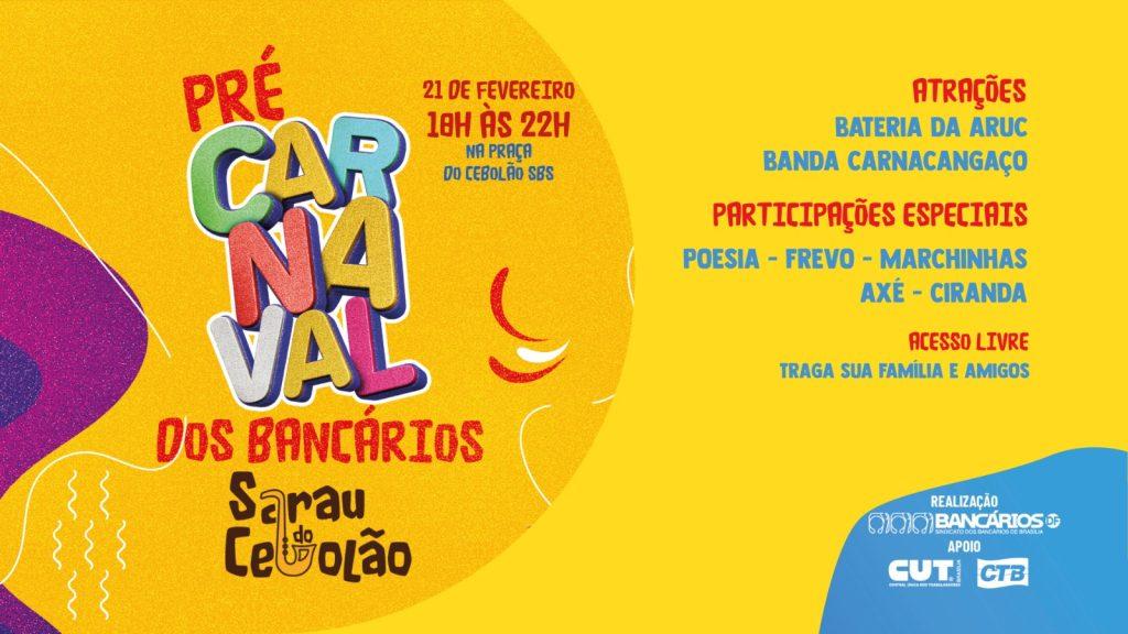 O Sarau do Cebolão abre alas nesta sexta-feira (21), a partir das 18h, para o Pré-Carnaval dos Bancários. O grito de Carnaval da categoria, que terá como palco o Setor Bancário Sul, é gratuito e promovida pelo Sindicato, trazendo uma programação repleta de ritmos e tradições.