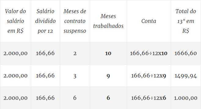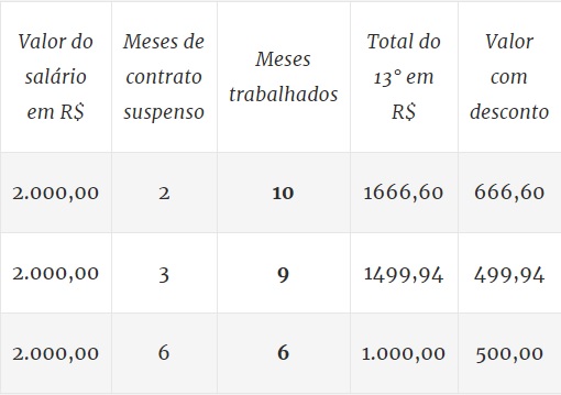 Os cálculos feitos por Adriana mostram que, se este mesmo trabalhador tiver o contrato suspenso por dois meses, recebera R$ 1.666,60 de 13º, se a suspensão do contrato foi por três meses, receberá R$ 1.499,94.