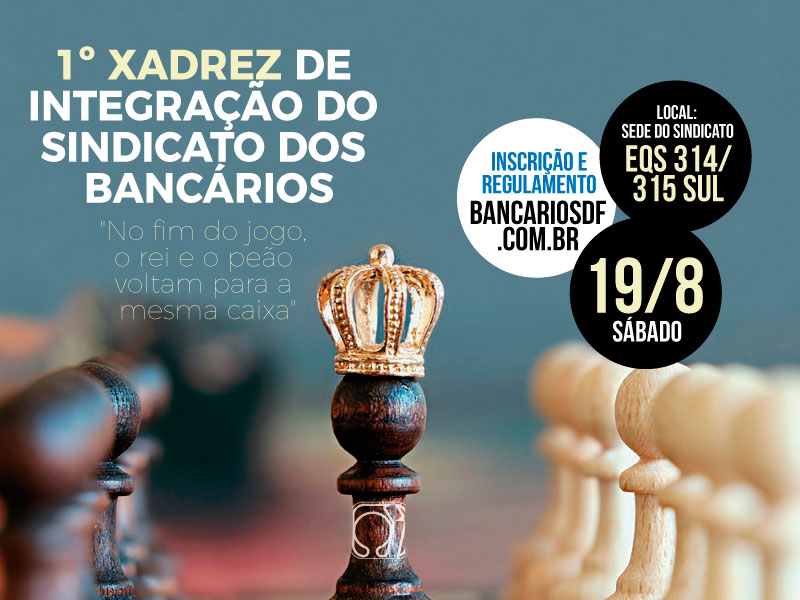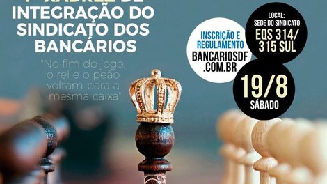 O Sindicato inicia as comemorações do Dia do Bancário este ano com o lançamento do 1º Xadrez de Integração. A competição, que será realizada na sede do Sindicato em 19 de agosto, com início às 10h, tem inscrições abertas até o dia 17, podendo participar bancários e bancárias sindicalizados e seus dependentes.