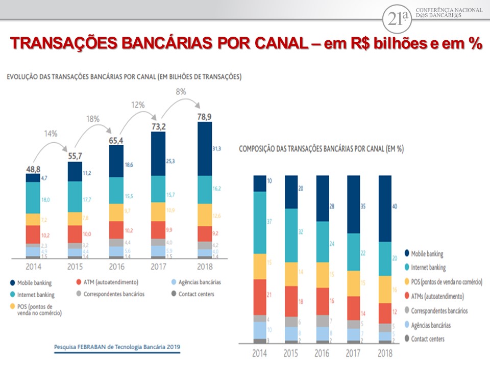 Com isso, tem crescido o volume de transações bancárias realizadas por meio tecnológico. As transações por celulares de pagamento de conta, por exemplo, cresceram 80%. Os dados apontam que, no total, 40% das transações são realizadas por celular e 20% pela internet. Apenas 5% das transações são realizadas nas agências. “E as transações por meio tecnológico vem crescendo ano a ano. São transações sem qualquer intermediação humana. E os clientes pagam cada vez mais caro por serviços que eles mesmos realizam”, observou Vivian.