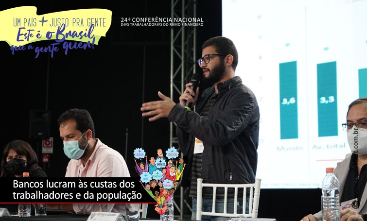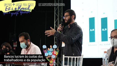 Na primeira mesa da tarde deste sábado (11), da 24ª Conferência Nacional dos Trabalhadores do Ramo Financeiro, o economista da subseção do Departamento Intersindical de Estatística e Estudos Socioeconômicos (Dieese) na Confederação Nacional dos Trabalhadores do Ramo Financeiro (Contraf-CUT), Gustavo Machado Cavarsan, realizou uma análise da conjuntura econômica. “Vimos no primeiro trimestre do ano os lucros dos bancos atingindo novos recordes e espelhando o modelo econômico concentrador de renda que vigora no país”, disse. A mesa foi mediada pelo presidente do Sindicato, Kleytton Morais.