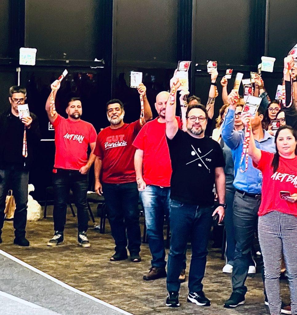 As 632 delegadas e delegados representantes de sindicatos de bancários de todo o país, reunidos em São Paulo, na 26ª Conferência Nacional dos Trabalhadores do Ramo Financeiro, aprovaram, neste domingo (9), a minuta de reivindicações da categoria, que será entregue aos bancos no dia 18, para que se dê início às negociações da Campanha Nacional dos Bancários. Grande parte da delegação do Rio Grande do Sul participou remotamente por plataforma digital de videoconferência e votação.