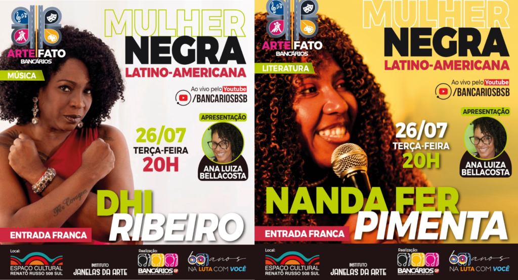 Dada a proximidade com a data, a 26ª Edição do Arte Fato, que acontece dia 26 de julho a partir das 20h, abre suas cortinas para Dhi Ribeiro e Nanda Fer Pimenta. Enquanto Dhi tem na música sua expressão artística, Nanda encontrou na literatura e na moda o caminho para dialogar com o mundo através das artes. O evento gratuito poderá ser acompanhado ao vivo, pelo canal do Sindicato no YouTube, ou presencialmente no Espaço Cultural Renato Russo (508 Sul, Bloco A).