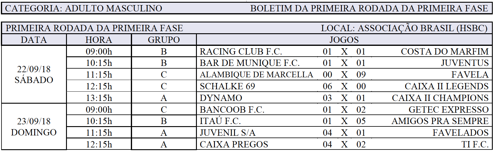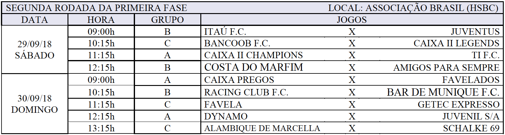 Os atletas bancários entram em campo novamente neste sábado (29) e no domingo (30) para a segunda rodada da primeira fase da Copa dos Bancários de Futebol Society, edição 2018. Os jogos têm início às 9h, na Associação Brasil, no Park Way.