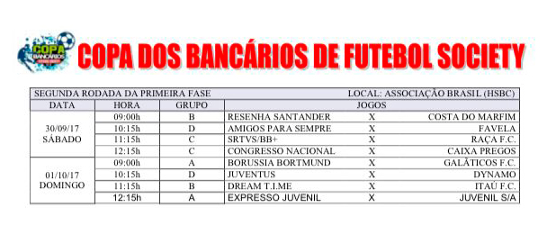 Os atletas bancários entram em campo novamente neste fim de semana para a segunda rodada da primeira fase da Copa dos Bancários de Futebol Society, edição 2017. Os jogos têm início às 9h, na Associação Brasil, no Park Way.