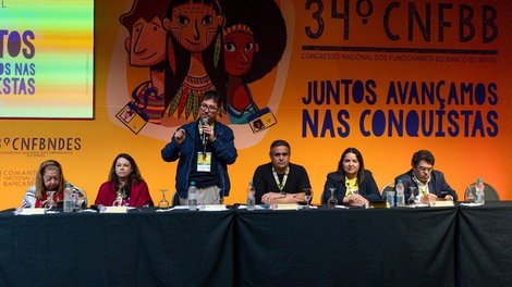 O presidente da Caixa de Previdência dos Funcionários do Banco do Brasil (Previ), João Fukunaga, abriu a mesa “Previdência”, do 34º Congresso Nacional dos Funcionários do Banco do Brasil, fazendo um balanço da conjuntura para os fundos de pensão fechados e que incluem a continuidade de ataques de setores privados, por meio de entidades reguladoras e do Congresso.