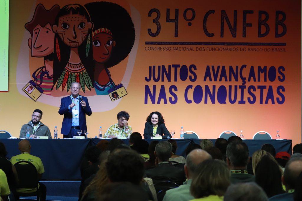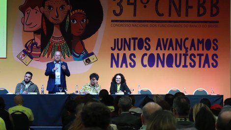 Depois da aprovação do regimento interno, teve início os trabalhos do 34º Congresso Nacional dos Funcionários do Banco do Brasil, na manhã desta quarta-feira (5). A mesa inicial, intitulada “Os desafios da sociedade e dos trabalhadores”, contou com a participação de José Dirceu, ex-ministro-chefe da Casa Civil no primeiro Governo Lula, e Juvandia Moreira, presidenta da Confederação Nacional dos Trabalhadores do Ramo Financeiro (Contraf-CUT) e também coordenadora do Comando Nacional dos Bancários.