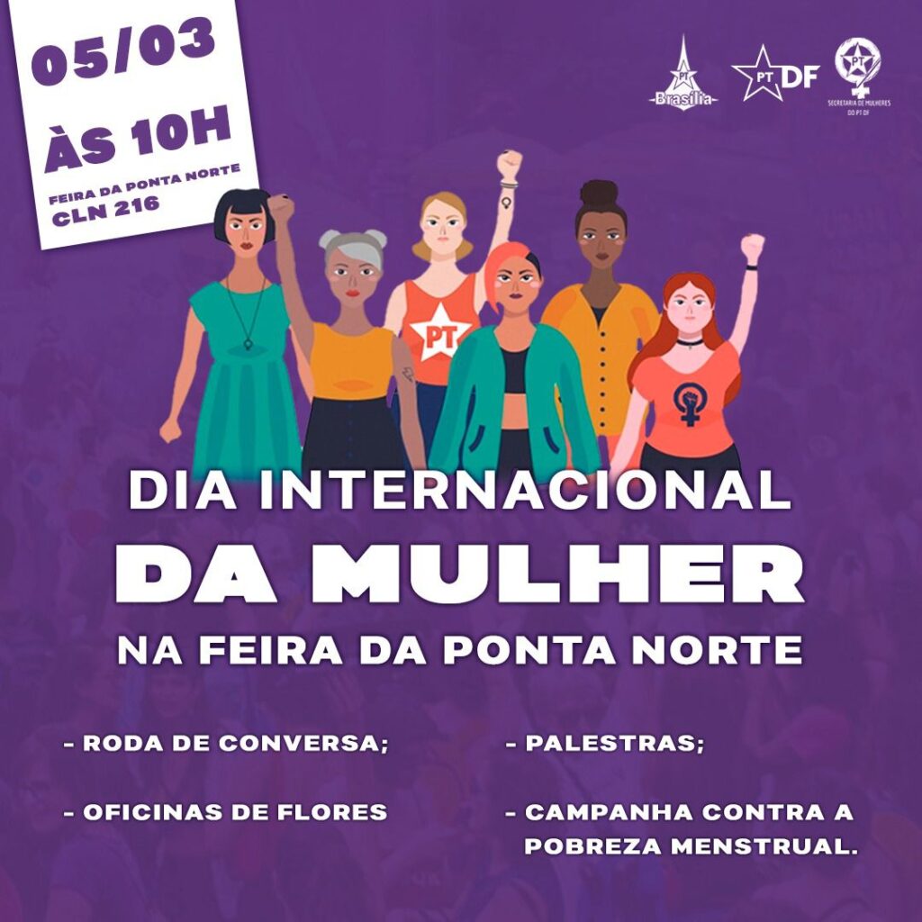 A roda de conversa contará com a presença de deputadas do PT e da secretária de Mulheres do PT-DF, Andreza Xavier; de representantes do MST, MTST e das Mulheres Camponesas; da presidenta do Sindicato da Embrapa (Sinpaf/sede), Mirane Costa; e do Coletivo Teia Solidária, com a Campanha de Combate à Pobreza Menstrual, além da participação do Coletivo Flores pela Democracia com oficina de confecção de flores.