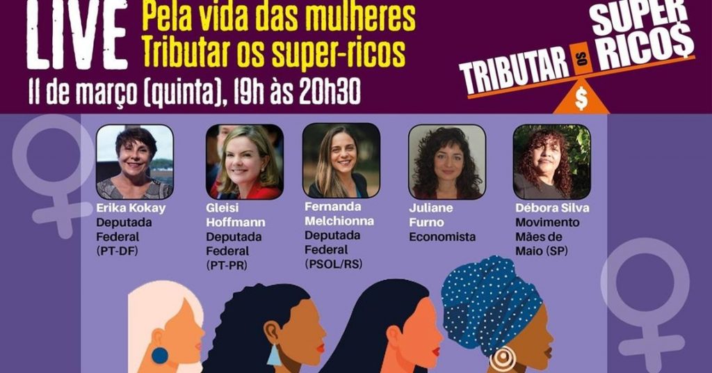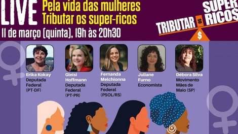 'Pela vida das mulheres, tributar os super-ricos' é o tema da live que acontecerá no dia 11 de março, das 19h às 20h30, que terá como participantes economistas, parlamentares e ativistas de movimentos sociais. A iniciativa é do coletivo Tributar os Super Ricos.