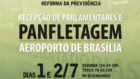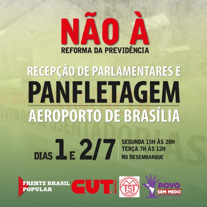 CUT Brasília, Movimento dos Trabalhadores Sem Teto (MTST), Frente Brasil Popular e Frente Povo Sem Medo realizarão recepção de parlamentares e panfletagem contra a reforma da Previdência nesta segunda e terça-feira (1 e 2/7), no aeroporto Juscelino Kubitschek. Na segunda, a ação será das 15h às 20h. Já na terça, a atividade acontecerá das 7h às 12h. Em ambos os dias, a concentração será no desembarque.