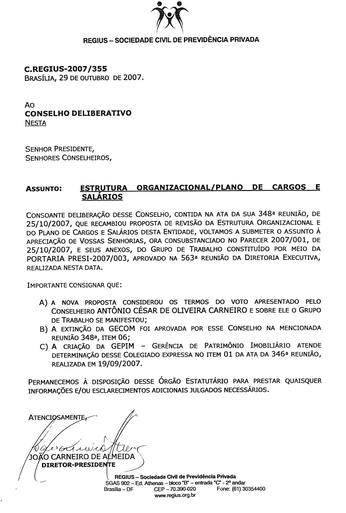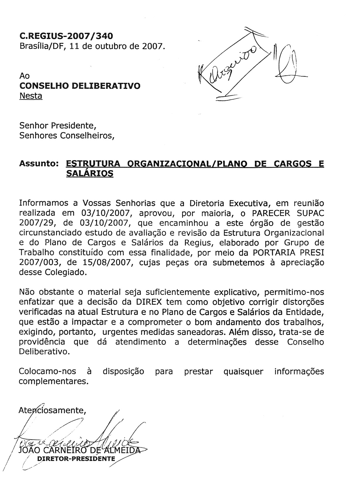 1) No comunicado da Regius, a diretoria afirma que matéria veiculada pelo Sindicato dos Bancários em 26/10/07 informando da pretensão do presidente da Regius de elevar seu salário para quase R$ 20 mil era falsa. No documento C. Regius 2007/340, datado de 11/10/07, assinado pelo senhor João Carneiro, que trata da nova estrutura organizacional da Regius, onde consta proposta de reajuste de seu salário para R$ 19.882,26 e dos demais diretores para R$ 18.807,54. A proposta foi discutida pelo Conselho Delibe-rativo em 25/10/07 na reunião de número de 348 daquele colegiado. Reunião esta em que o conselheiro indicado pela patrocinadora Antonio César apresentou voto alternativo contra a proposta da diretoria e propondo uma remuneração de R$ 14.481,72 para o presidente e R$ 13.165,20 para os diretores. Importante lembrar que, após este voto, o conselheiro Antonio César foi destituído da condição de conselheiro titular. Veja abaixo fac-símiles das correspondências da Regius.
