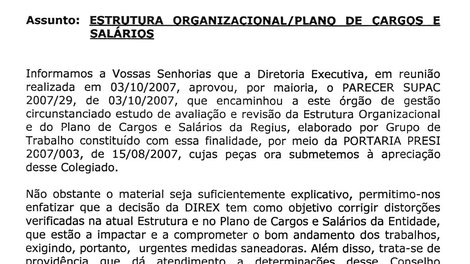 1) No comunicado da Regius, a diretoria afirma que matéria veiculada pelo Sindicato dos Bancários em 26/10/07 informando da pretensão do presidente da Regius de elevar seu salário para quase R$ 20 mil era falsa. No documento C. Regius 2007/340, datado de 11/10/07, assinado pelo senhor João Carneiro, que trata da nova estrutura organizacional da Regius, onde consta proposta de reajuste de seu salário para R$ 19.882,26 e dos demais diretores para R$ 18.807,54. A proposta foi discutida pelo Conselho Delibe-rativo em 25/10/07 na reunião de número de 348 daquele colegiado. Reunião esta em que o conselheiro indicado pela patrocinadora Antonio César apresentou voto alternativo contra a proposta da diretoria e propondo uma remuneração de R$ 14.481,72 para o presidente e R$ 13.165,20 para os diretores. Importante lembrar que, após este voto, o conselheiro Antonio César foi destituído da condição de conselheiro titular. Veja abaixo fac-símiles das correspondências da Regius.