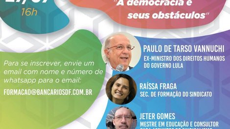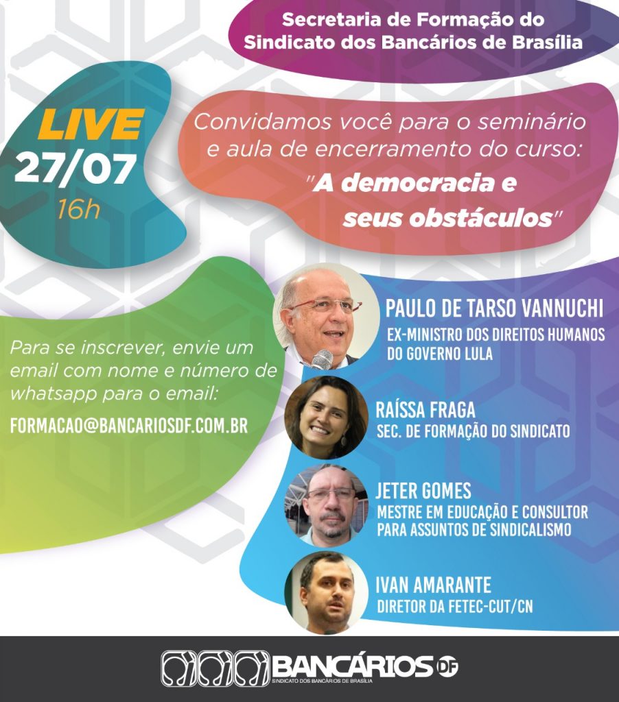 A Secretaria de Formação do Sindicato convida os bancários e as bancárias para assistirem ao seminário de encerramento do curso “A democracia e seus obstáculos”, no dia 27, às 16h. O evento online terá como palestrante o ex-ministro dos Direitos Humanos do governo Lula Paulo Tarso Vannuchi.