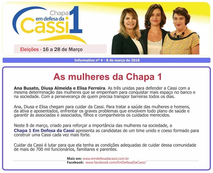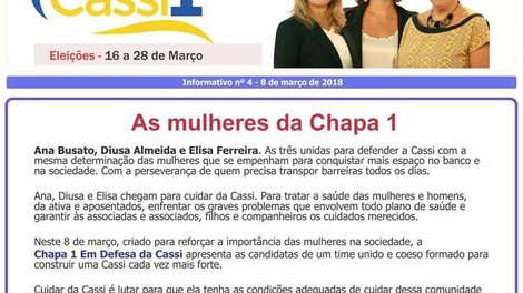 Neste 8 de Março, a Chapa 1 - Em defesa da Cassi apresenta as candidatas de um time unido e coeso para construir uma Cassi cada vez mais forte.