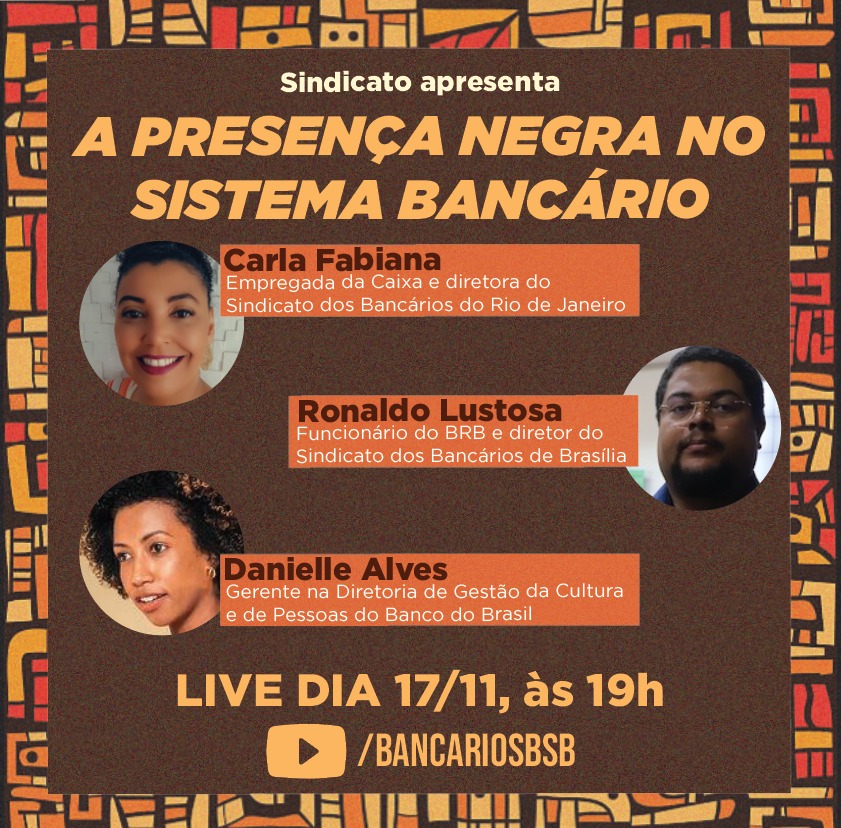A categoria bancária é composta predominantemente por pessoas brancas e, dentro dos bancos, os reflexos da sociedade racista em que vivemos também exclui os trabalhadores negros. Na terça-feira (17), a partir das 19h, bancários negros do DF e de outros estados conversam sobre suas experiências no ambiente bancário em live proposta pelo Sindicato e que vai ao pelo canal da entidade no Youtube.