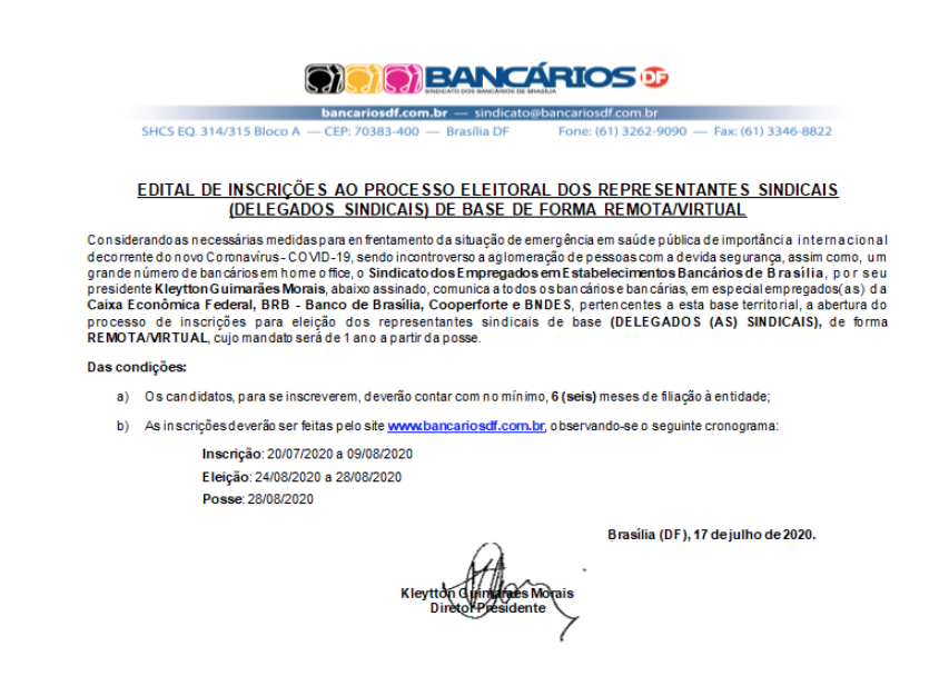 De acordo com o edital, disponível abaixo, as eleições se darão em plataforma digital de 24 a 28 de agosto, dia em que os eleitos serão empossados. Todos os bancários podem votar.