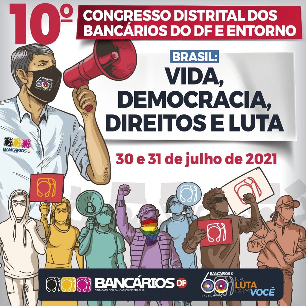 Os bancários e bancárias do DF e Entorno se reúnem neste sábado (31), no 10º Congresso Distrital, para definir o plano de lutas da categoria para o próximo período. Entre os principais desafios estão o enfrentamento da pandemia, em defesa da saúde e da vida, o combate ao desmonte dos bancos públicos e às privatizações e garantia de emprego e de direitos.