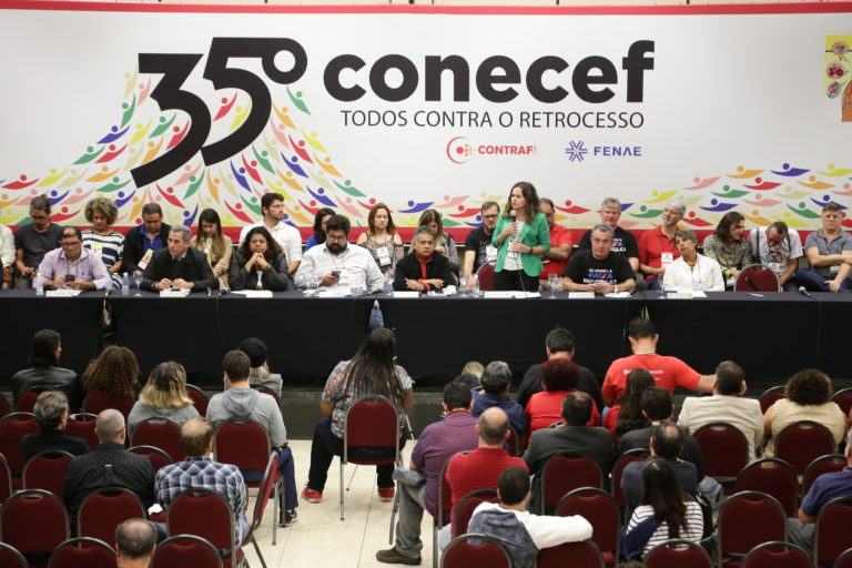 Jair Ferreira, presidente da Fenae, contou que todos os embates já vividos pela categoria a tornou ainda mais forte. “A gente já fez congressos da Caixa que tínhamos centenas de demitidos, na época Collor, por exemplo. Mas, a gente resistiu. Os trabalhadores foram reintegrados e continuamos. A conjuntura atual vai carecer de gente com muita determinação e resistência. Estamos num momento que precisamos atuar em conjunto com as entidades e forças políticas, pois sabemos que com certeza vamos passar turbulência. Não tenho dúvidas da nossa missão: defender os trabalhadores, os direitos, a democracia e a soberania nacional.”