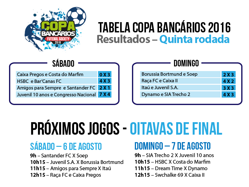 Com a quinta rodada deste final de semana (30 e 31 de julho), no campo da Associação Brasil, no ParkWay, termina a primeira fase da Copa dos Bancários 2016, que classificou 16 equipes para as oitavas de final.