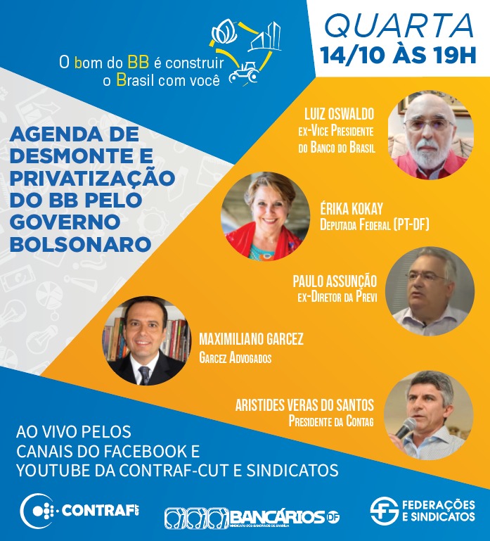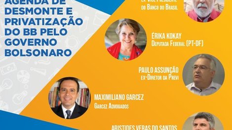 ‘Denúncia e atuação contra a agenda de desmonte e privatizante do governo Bolsonaro contra o BB’ é o tema do debate do segundo dia do seminário online “O bom do BB é construir o Brasil com você -- Banco do Brasil, de parabéns há 212 anos”, nesta quarta-feira (14), às 19h. A atividade faz parte da campanha em defesa do BB, lançada pelo Sindicato dos Bancários de Brasília, Contraf-CUT, demais sindicatos e federações de bancários, nesta terça-feira (13).