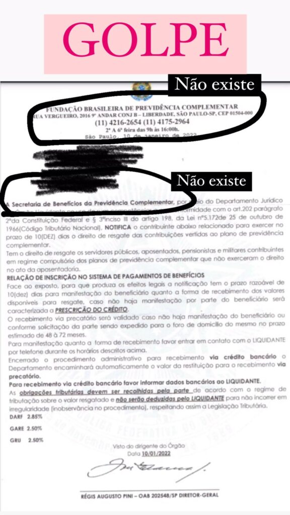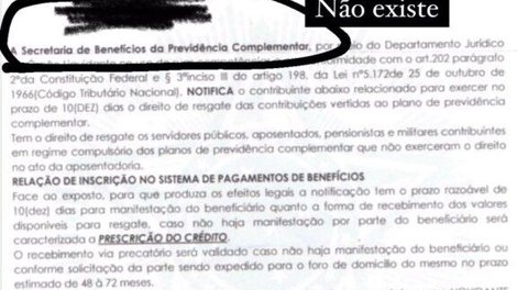 Para identificar se a correspondência é falsa, pesquise os nomes das entidades: Fundação Brasileira de Previdência complementar não existe; Secretaria de Benefícios de Previdência Complementar também não existe. E não existe o procedimento de depositar um dinheiro para receber algo que estaria "bloqueado", ou crédito a prescrever.