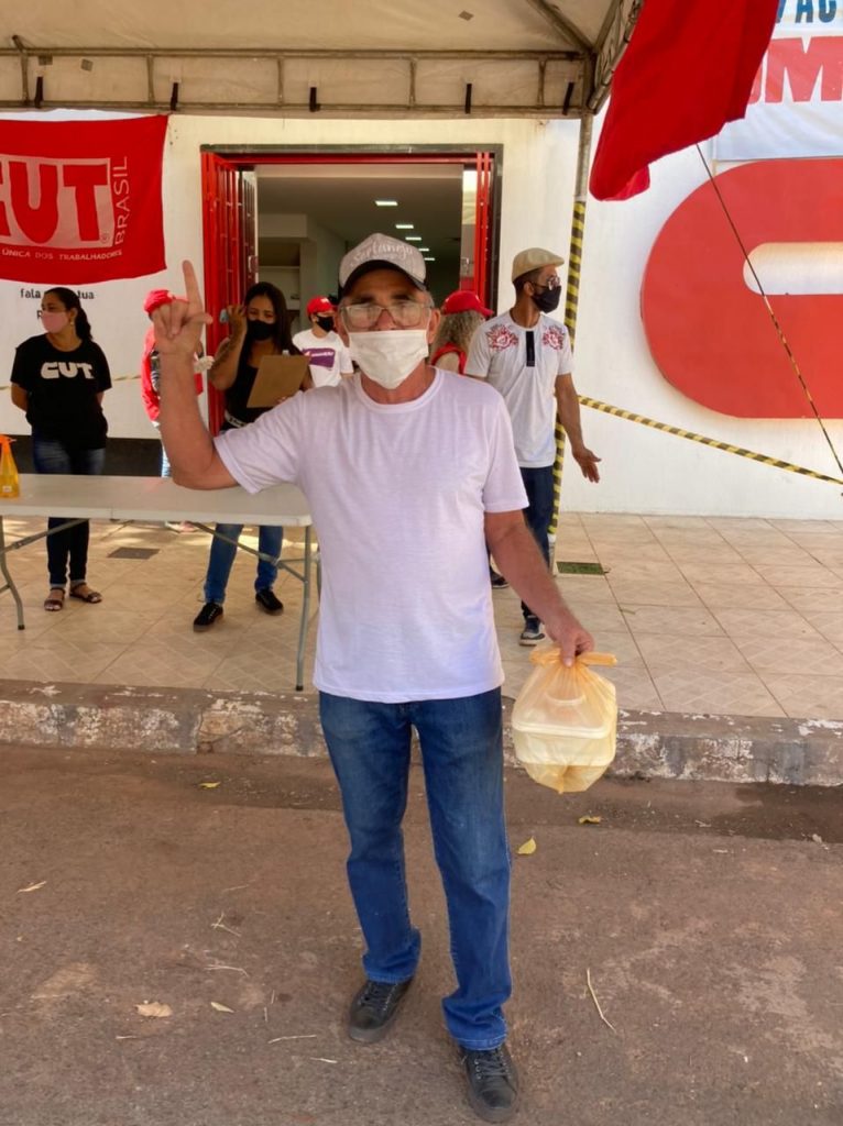 Eram quase 11h15 quando Valter Matos chegou na sede da CUT-DF para retirar sua refeição. Ele, que é servidor público aposentado, ficou sabendo do almoço solidário pelas redes sociais e levou consigo duas marmitas: uma de rocambole de carne e outra de bobó de frango, ambas acompanhadas por arroz, farofa e salada.