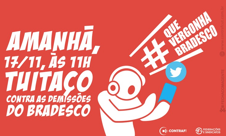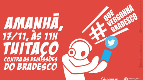 Os bancários de todo o Brasil vão participar nesta terça-feira (17), às 11h, do tuitaço contra as demissões no Banco Bradesco. Os trabalhadores devem utilizar e divulgar as hashtags #QueVergonhaBradesco e #QuemLucraNãoDemite nos seus perfis nas redes sociais, preferencialmente no Twitter. A ação faz parte da campanha organizada pela Confederação Nacional dos Trabalhadores do Ramo Financeiro (Contraf-CUT) e pela Comissão de Organização dos Empregados (COE) do Bradesco, que visa denunciar a quebra do compromisso assumido pela Federação Nacional dos Bancos (Fenaban), feito em mesa de negociação com o Comando Nacional Bancário, de não realizar demissões durante a pandemia.