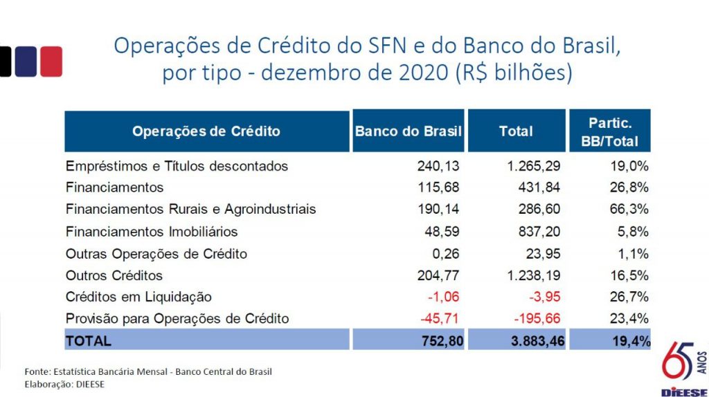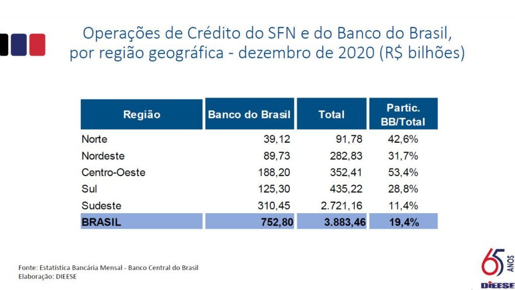 A apresentação da economista Nádia Vieira de Souza, do Departamento Intersindical de Estatística e Estudos Socioeconômicos (Dieese) reforçou a visão de que o Banco do Brasil, assim como os demais bancos públicos, desempenha um importante papel no desenvolvimento do país, tanto em decorrência da concessão de crédito, principalmente no crédito rural, mas também na execução de programas sociais do Governo Federal. “Mas, nos últimos anos, temos visto um ataque sistemático a todos os bancos públicos, incluindo o Banco do Brasil. Isso tem reduzido cada vez mais sua atuação”, observou a economista. “Mas, mesmo com esses ataques, a participação do BB no total de crédito fechou 2020 em 19,4%, com peso ainda maior nas regiões Norte, Nordeste e Centro-Oeste”, completou.