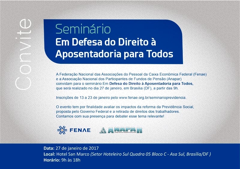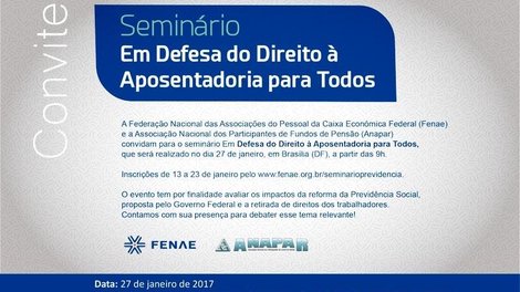 A Federação Nacional das Associações do Pessoal da Caixa Econômica Federal (Fenae) e a Associação Nacional dos Participantes de Fundos de Pensão (Anapar) realizam no próximo dia 27 o seminário “Em Defesa do Direito à Aposentadoria para Todos”.