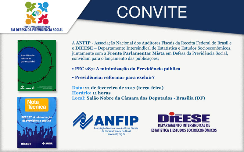 A ANFIP (Associação dos Auditores Fiscais da Receita Federal do Brasil) e o Dieese (Departamento Intersindical de Estatística e Estudos Socioeconômicos), em conjunto com a Frente Parlamentar Mista em Defesa da Previdência, lançam na próxima terça-feira, dia 21 de fevereiro, no Salão Nobre da Câmara dos Deputados, as publicações “PEC 287: A minimização da Previdência Pública” e “Previdência: reformar para excluir?”.