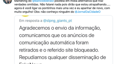Na tarde desta quinta-feira (21), o Sindicato publicou matéria sobre a denúncia feita pelo movimento Sleeping Giants Brasil. Pelo Twitter, o BB respondeu ao alerta do Sleeping Giants, afirmando que “os anúncios de comunicação automática foram retirados e o referido site bloqueado” e que a instituição repudia “qualquer disseminação de fake news”.