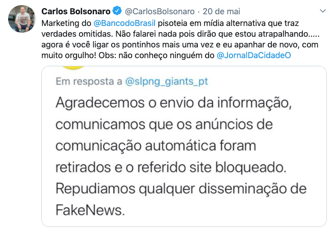 A decisão anunciada pelo Banco do Brasil sobre anúncio em site propagador de fake news caiu por terra. A reclamação do filho 02 de Jair Bolsonaro pode ser o motivo do banco voltar atrás na retirada de anúncios do site do Jornal da Cidade Online.