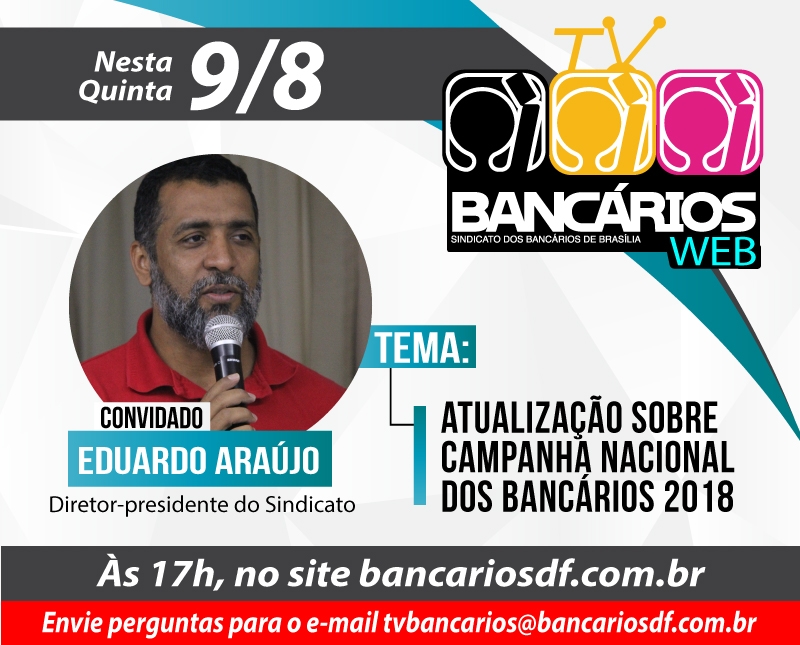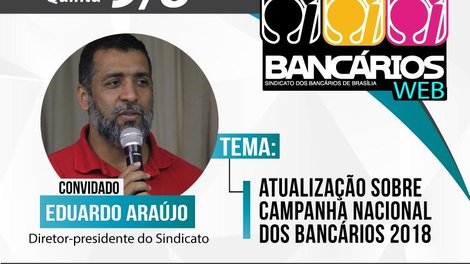 A semana está sendo agitada para bancários e bancárias. A edição desta quinta-feira (9) do programa TV Bancários Web traz as novidades da Campanha Nacional da categoria com participação do presidente do Sindicato, Eduardo Araújo. O programa será transmitido ao vivo, a partir das 17h, pelas redes sociais do Sindicato.