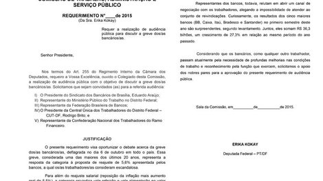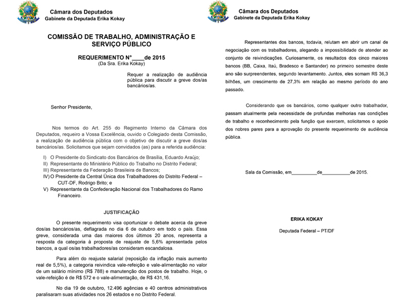 Em sua justificativa, a deputada Erika Kokay escreveu: “considerando que os bancários, como qualquer outro trabalhador, passam atualmente pela necessidade de profundas melhorias nas condições de trabalho e reconhecimento pela função que exercem, solicitamos o apoio dos nobres pares para a aprovação do presente requerimento de audiência pública”.
