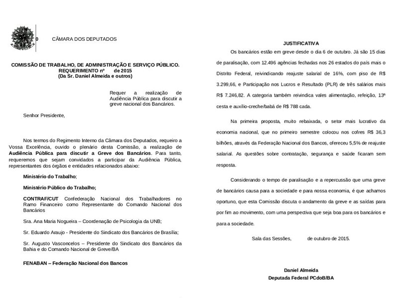 “Considerando o tempo de paralisação e a repercussão que uma greve de bancários causa para a sociedade e para nossa economia, é que achamos oportuno que esta comissão discuta o andamento da greve e as saídas para por fim ao movimento, com uma perspectiva boa para os bancários e para a sociedade”, afirmou Daniel Almeida na justificativa do requerimento apresentado à Comissão de Trabalho da Câmara dos Deputados.