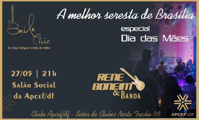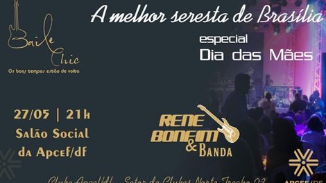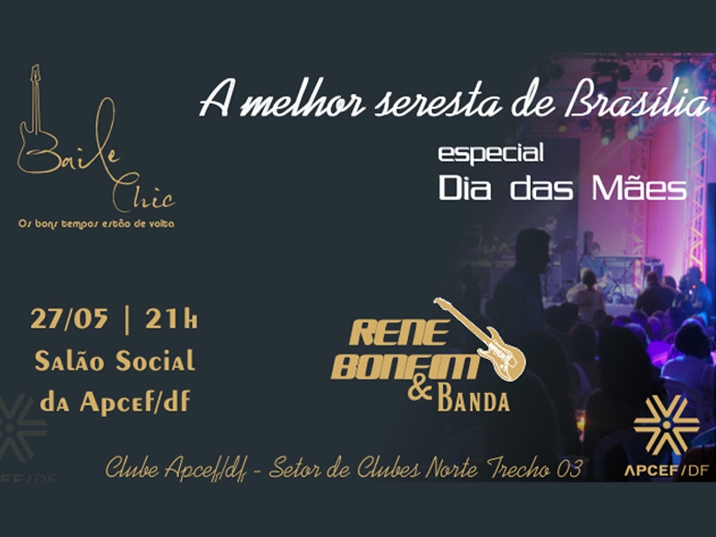 A Associação de Pessoal da Caixa Econômica Federal (Apcef/DF) promoverá no dia 27 deste mês, a partir das 21h, o “Baile Chic”, uma edição especial em homenagem ao Dias das Mães. O evento contará com a melhor seresta de Brasília, com a Rene Bonfim & Banda, e DJ Júnior.