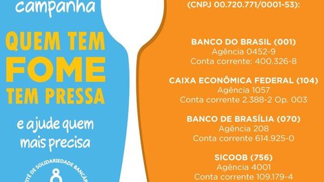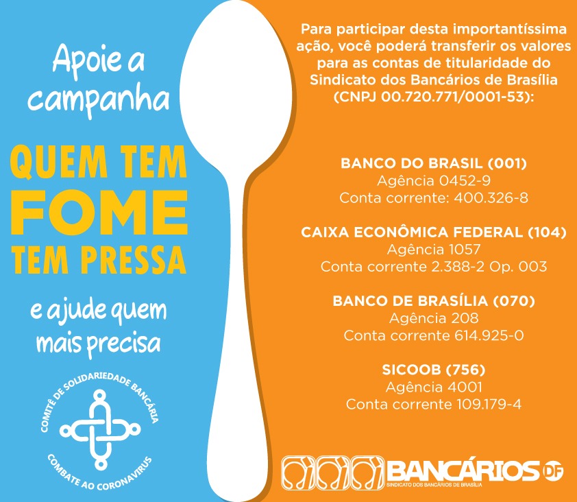 O Sindicato conclama bancárias e bancários, sócios e ainda não sócios, e sociedade em geral, a exemplo da feliz campanha do Betinho “Quem tem fome, tem pressa”, a doarem valores cujo parâmetro corresponde a um dia do vale-refeição, ou seja, R$ 37,71 uma conquista histórica e assegurada nos acordos coletivos e convenção da categoria.