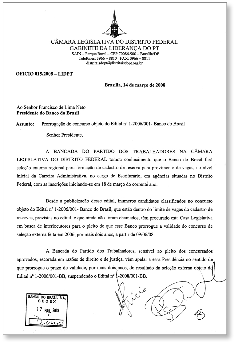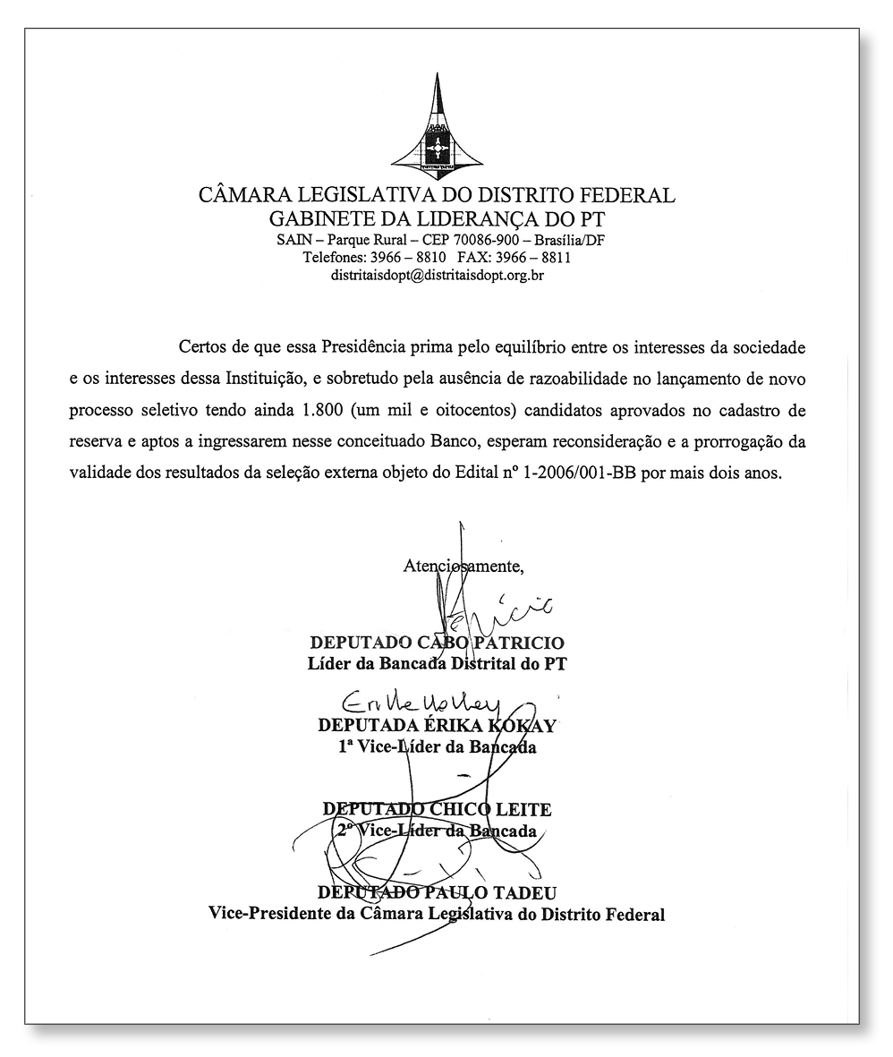 Presente na reunião, a deputada distrital Erika Kokay (PT) informou que a bancada do Partido dos Trabalhadores na Câmara Legislativa do DF enviou ofício ao presidente do BB, Francisco Lima Neto, solicitando a prorrogação do concurso (veja fac-símile abaixo). O senador Cristovam Buarque (PDT) também encaminhou ofício ao presidente do banco manifestando seu apoio aos aprovados no concurso.