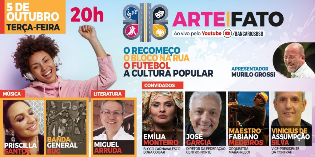 A 13ª edição do Arte|Fato, programa cultural promovido pelo Sindicato, vai ao ar na terça-feira (5), a partir das 20h, com shows da cantora e bancária da Caixa Priscilla Santos e da banda General Bug, cujo guitarrista Fábio Chayb é funcionário do Banco do Brasil. A transmissão ao vivo pode ser acompanhada pelo canal da entidade sindical no youtube.com/user/bancariosbsb.