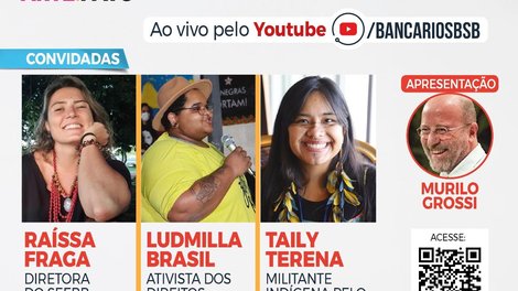 O debate, mediado por Murilo Grossi, tem como convidadas a estudante de sociologia, pela UnB, secretária LGBTQIA+, do PT/DF, e ex-diretora LGBT da UNE, Ludmila Brasil; a secretária de Formação do Sindicato e funcionária do Bradesco, Raissa Fraga; e a graduada em ciências sociais com bacharel em antropologia na UnB, Taily Terena, que atua como voluntária no Conselho Nacional de Mulheres Indígenas (Conami) e no Comitê Intertribal, Memória e Ciência Indígena (ITC).