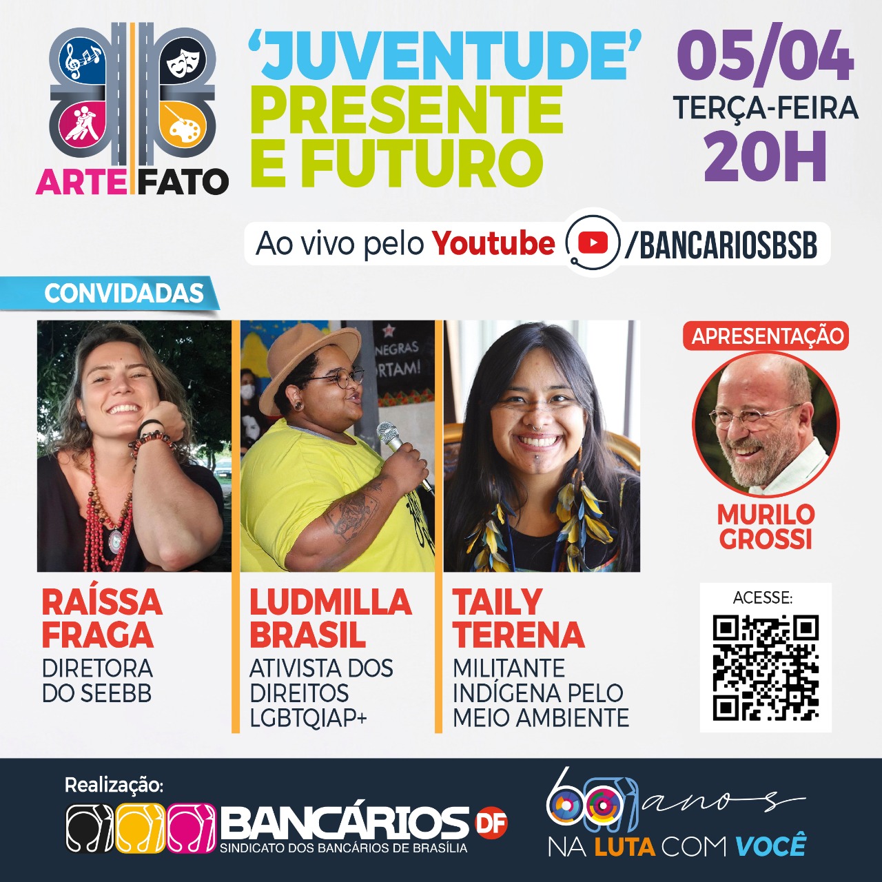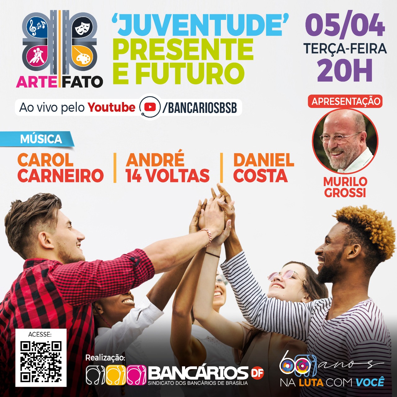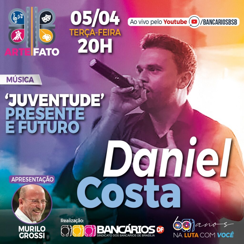 A 22ª edição do Arte|Fato, que o Sindicato promove na terça-feira (5), tem como atrações musicais três intérpretes de distintas vertentes da MPB -- Daniel Costa, André 14voltas e Carol Carneiro. O ator Murilo Grossi apresenta o programa que vai ao ar a partir das 20h, pelo canal youtube.com/bancariosbsb.