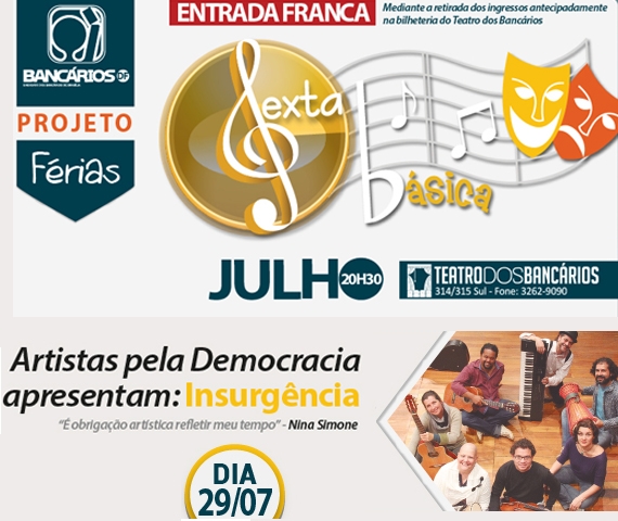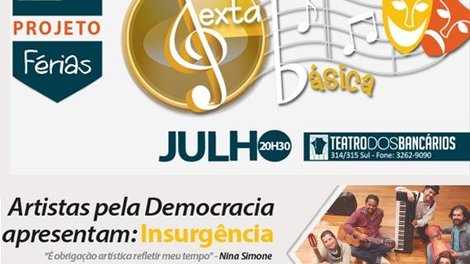 O show Insurgência é a atração do projeto cultural “Sexta Básica” que o Sindicato apresenta nesta sexta-feira (29), com a participação de alguns dos músicos que fazem parte do espetáculo e que congregam um coletivo denominado ‘Artistas pela Democracia’.