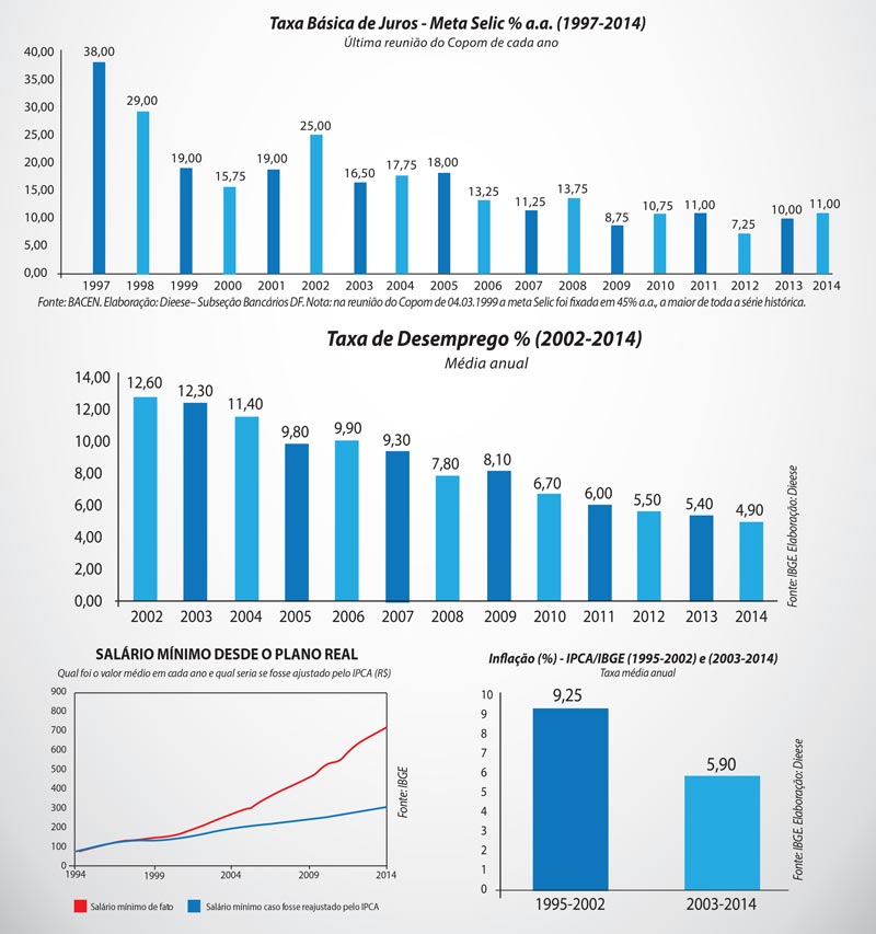Após período de muitas lutas, os trabalhadores avançaram nas conquistas e diminuíram as desigualdades e injustiças históricas do Brasil. Confira, abaixo, gráficos que mostram a queda da taxa de desemprego, aumento significativo do salário mínimo, controle da inflação e queda da taxa de juros.