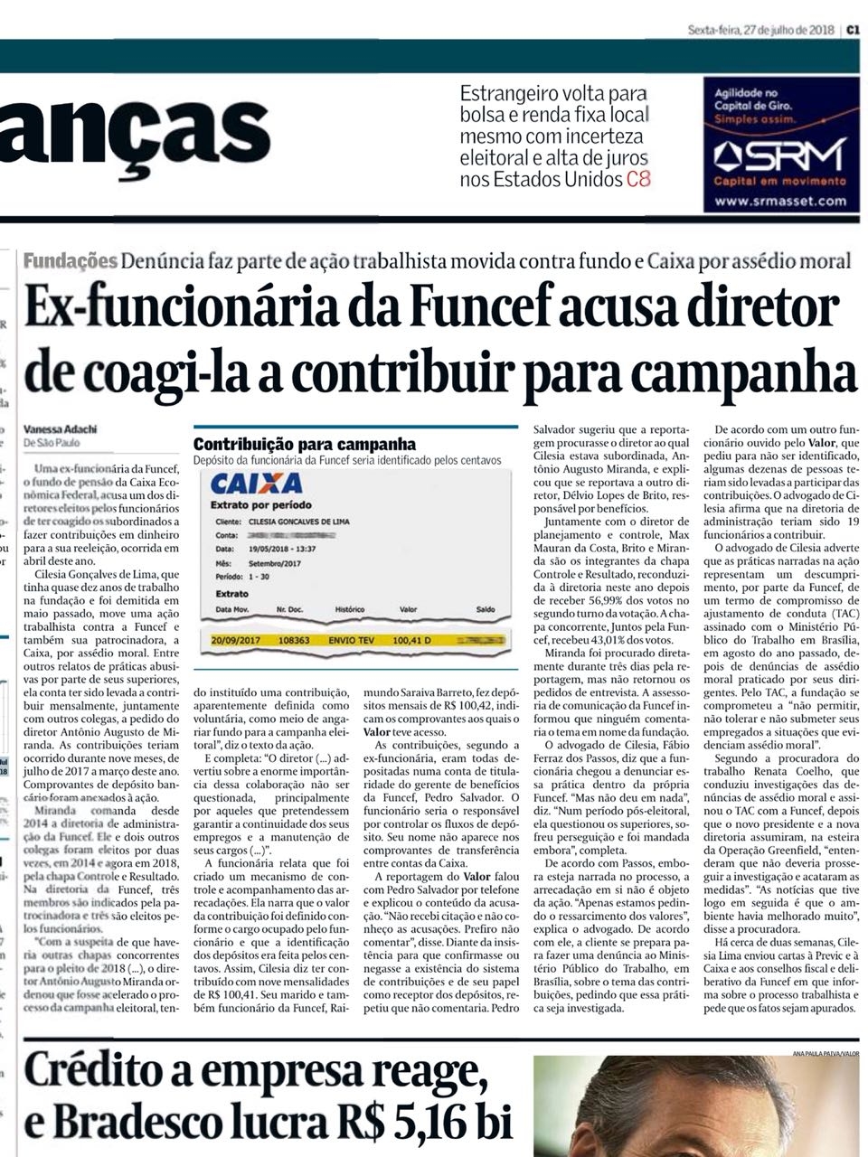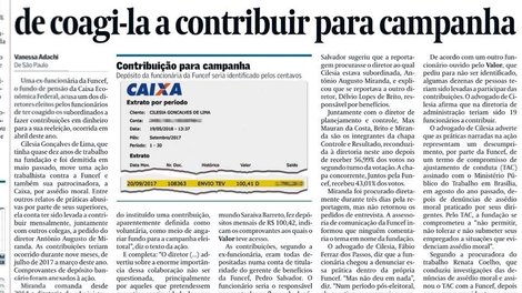 Uma ex-funcionária da Funcef acusa o diretor eleito de Administração de ter coagido os subordinados a dar contribuições em dinheiro para sua reeleição, ocorrida em abril deste ano. De acordo com a reportagem do Valor Econômico, publicada na manhã desta sexta-feira (27), Cilesia Gonçalves de Lima trabalhava há quase dez anos na Funcef e foi demitida um mês depois da eleição.