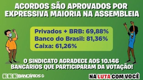 Logo após a conclusão das assembleias que ocorreram também por todo o país, com encerramento simultâneo ao de Brasília, a aprovação das propostas dos bancos, com validade de dois anos, foi confirmada na maioria das bases sindicais.