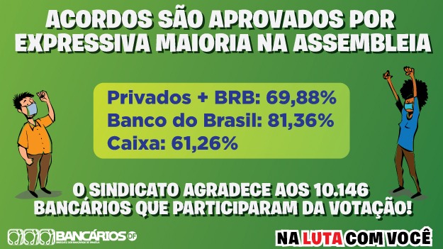 Em assembleia geral virtual concluída às 23h59 desta segunda-feira (31), os bancários e bancárias de Brasília aprovaram por ampla maioria as propostas da Fenaban, do Banco do Brasil e da Caixa para renovação da Convenção Coletiva de Trabalho (CCT) e dos acordos coletivos dos bancos públicos federais. Os funcionários do BRB já haviam aprovado a renovação do acordo específico em assembleia, também virtual, realizada em 24 de agosto.