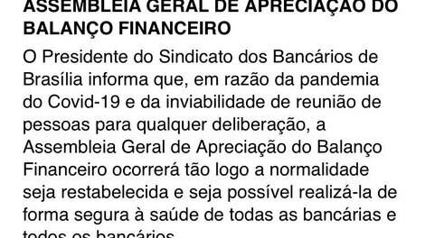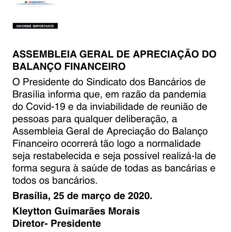 Diante da crise de saúde que passa o mundo em virtude do novo coronavírus, o Sindicato informa que a assembleia geral que vai apreciar o balanço financeiro da entidade será realizada assim que a normalidade for reestabelecida. A decisão segue as orientações dos órgãos de saúde mundial de evitar aglomerações.