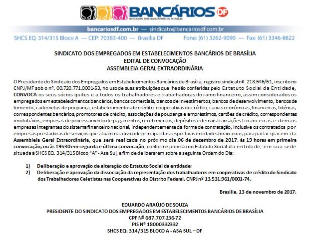 Dois assuntos estão na pauta: deliberação e aprovação de alteração do Estatuto Social da entidade; e deliberação e aprovação da dissociação da representação dos trabalhadores em cooperativas de crédito do Sindicato dos Trabalhadores Celetistas nas Cooperativas do Distrito Federal.