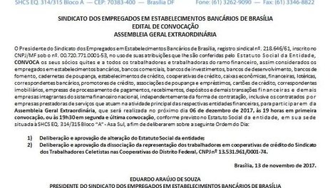 Dois assuntos estão na pauta: deliberação e aprovação de alteração do Estatuto Social da entidade; e deliberação e aprovação da dissociação da representação dos trabalhadores em cooperativas de crédito do Sindicato dos Trabalhadores Celetistas nas Cooperativas do Distrito Federal.